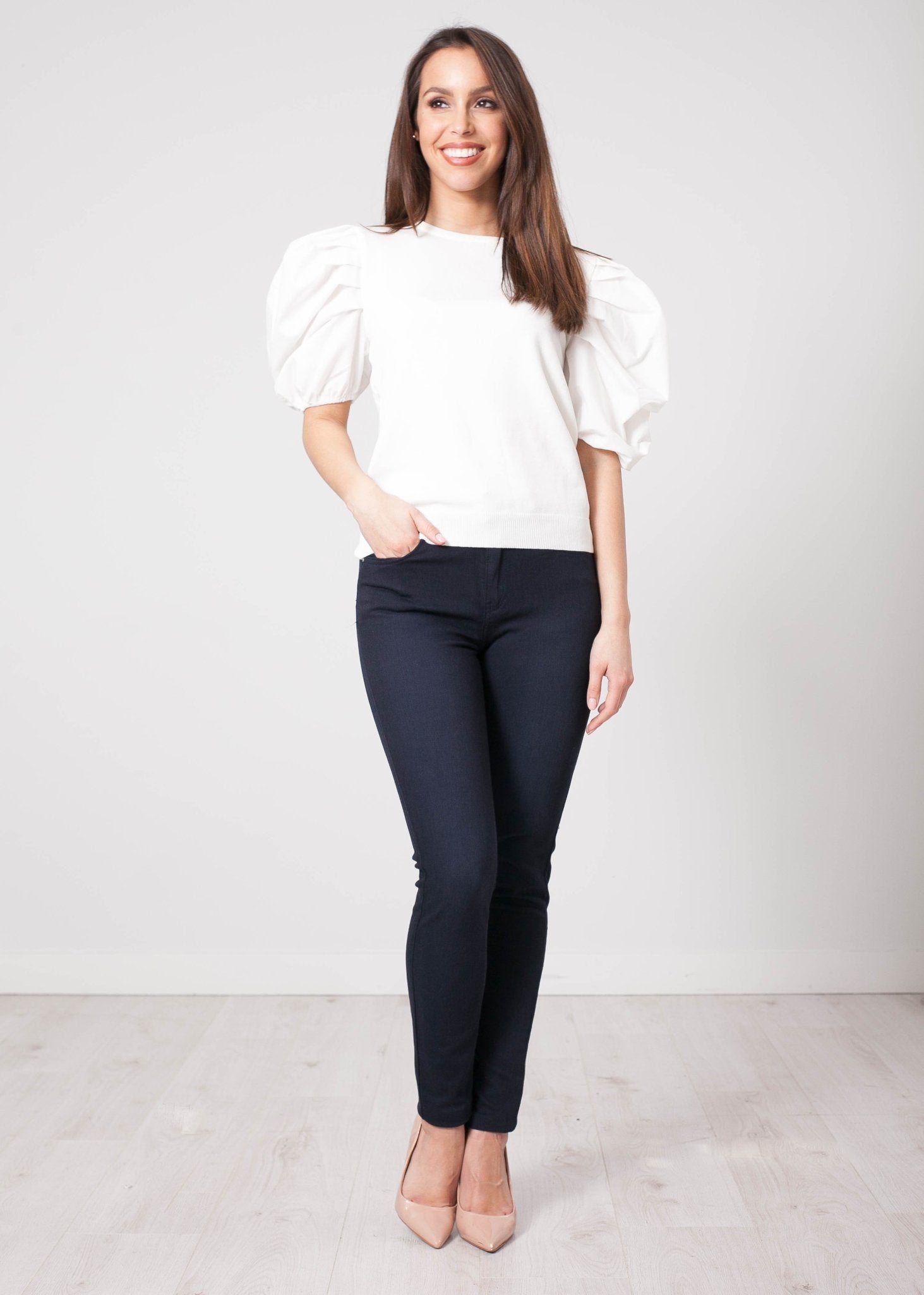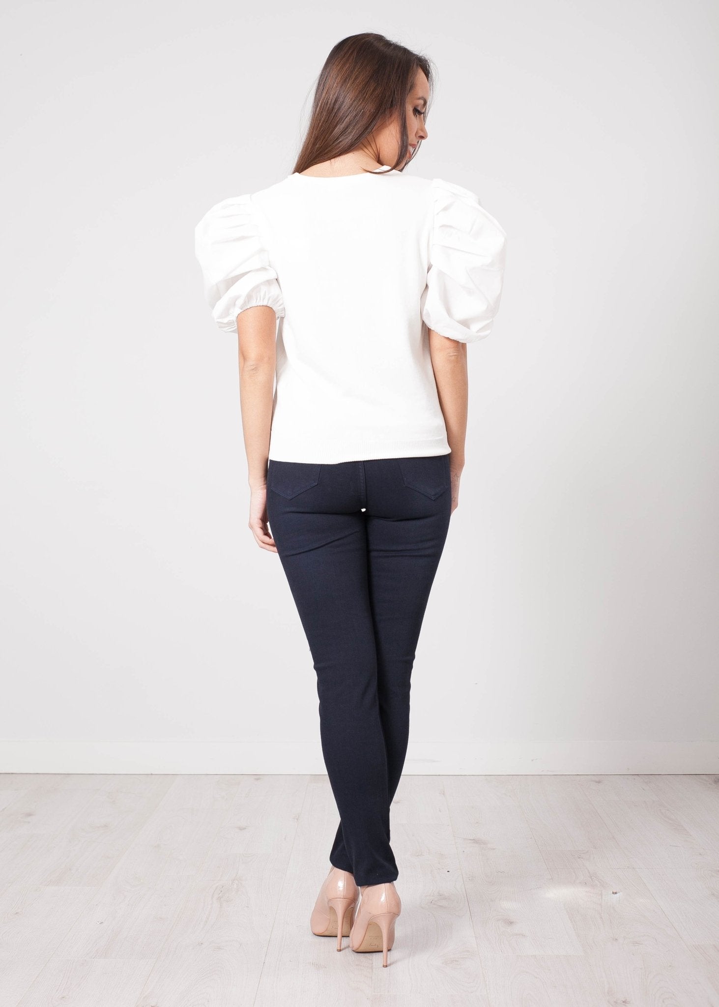 This adorable puff sleeve fine knit is ideal for styling with jeans or a midi skirt.