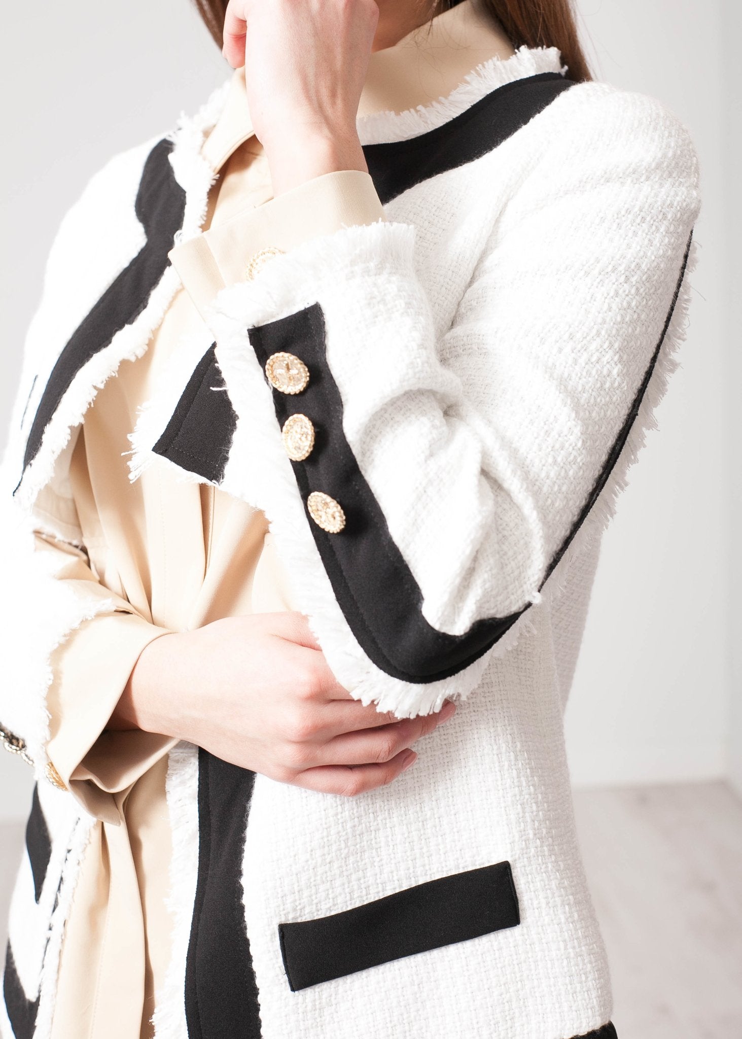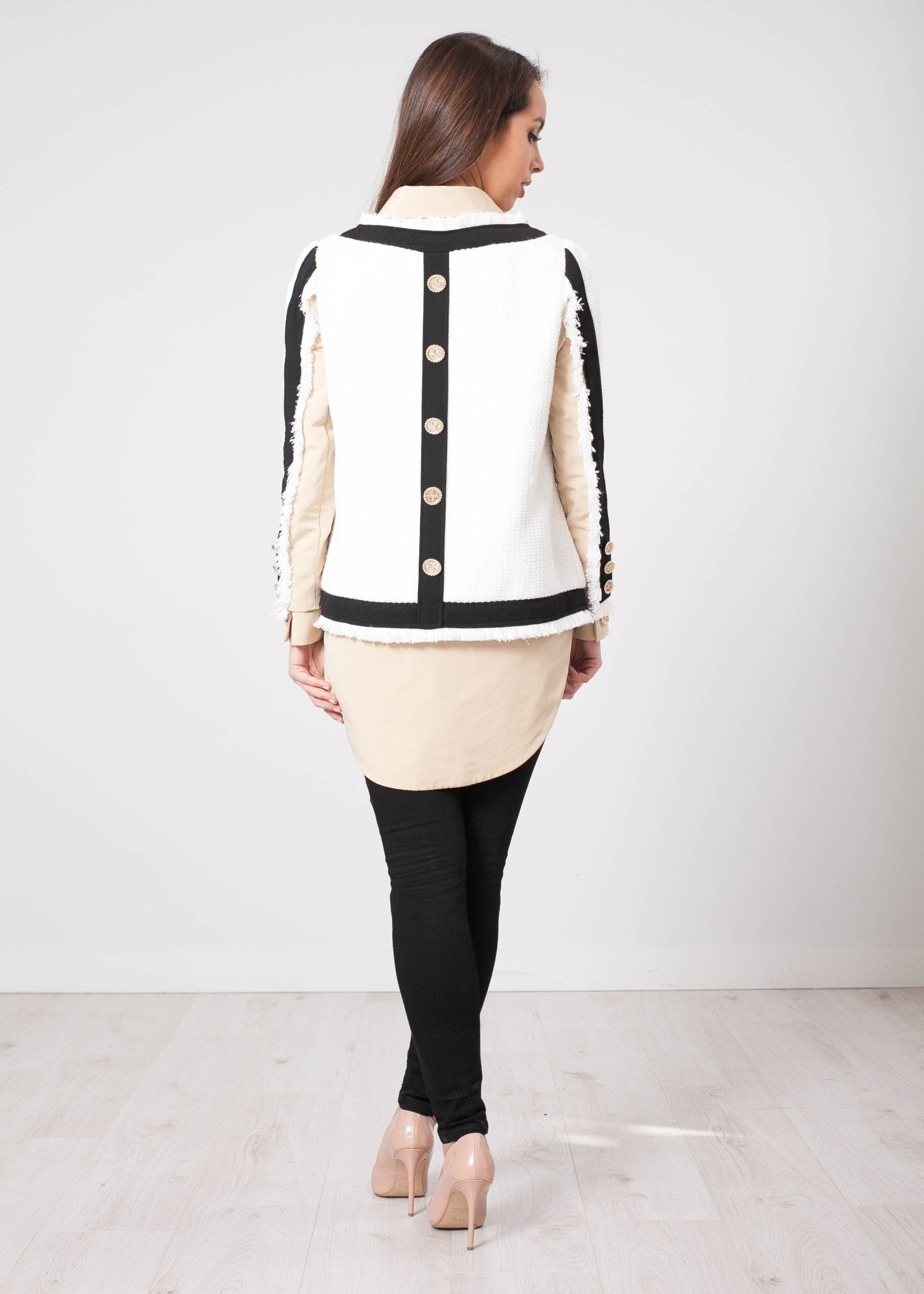 The super rich colour blouse effect is perfectly stitched in with the black and white tweed effect jacket.